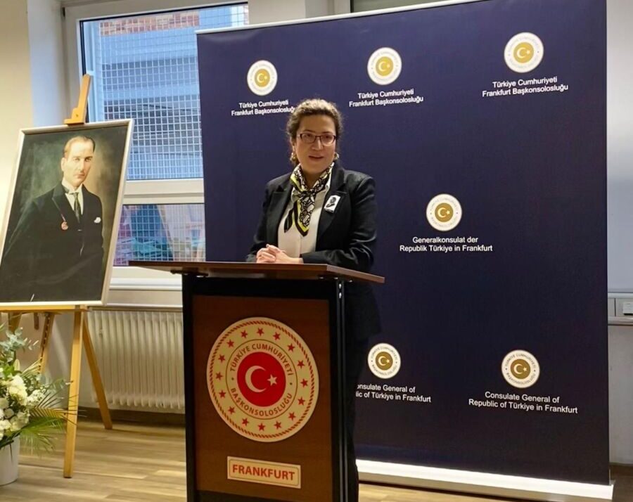 Zu Beginn der Zeremonie richtete Generalkonsulin İlknur Akdevelioğlu ein kurzes Begrüßungswort an die Anwesenden. Die Hauptansprache hielt Vize-Konsul Fatih Şahin, der sich an Vertreterinnen und Vertreter von Zivilgesellschaften, Medienvertreterinnen und -vertreter sowie die türkische Gemeinschaft in Frankfurt wandte.