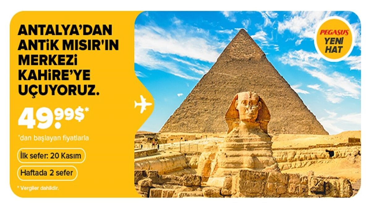 Die türkische Low-Cost-Fluggesellschaft Pegasus Airlines hat angekündigt, dass sie Flüge von Antalya nach Kairo, der Hauptstadt Ägyptens, aufnehmen wird. Die Flüge auf der Strecke Antalya-Kairo sollen am 20. November aufgenommen werden. Wie es hieß, soll die ägyptische Hauptstadt zweimal in der Woche angeflogen werden.