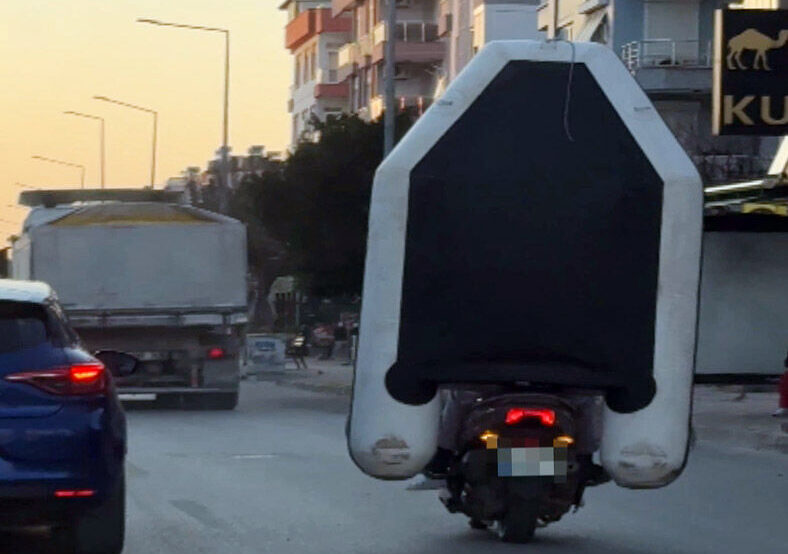 Eine gefährliche Szene im Straßenverkehr ist in Antalya mit dem Handy festgehalten worden: Zwei Männer transportierten im Stadtteil Konyaaltı ein aufgeblasenes Schlauchboot – auf einem fahrenden Motorrad.